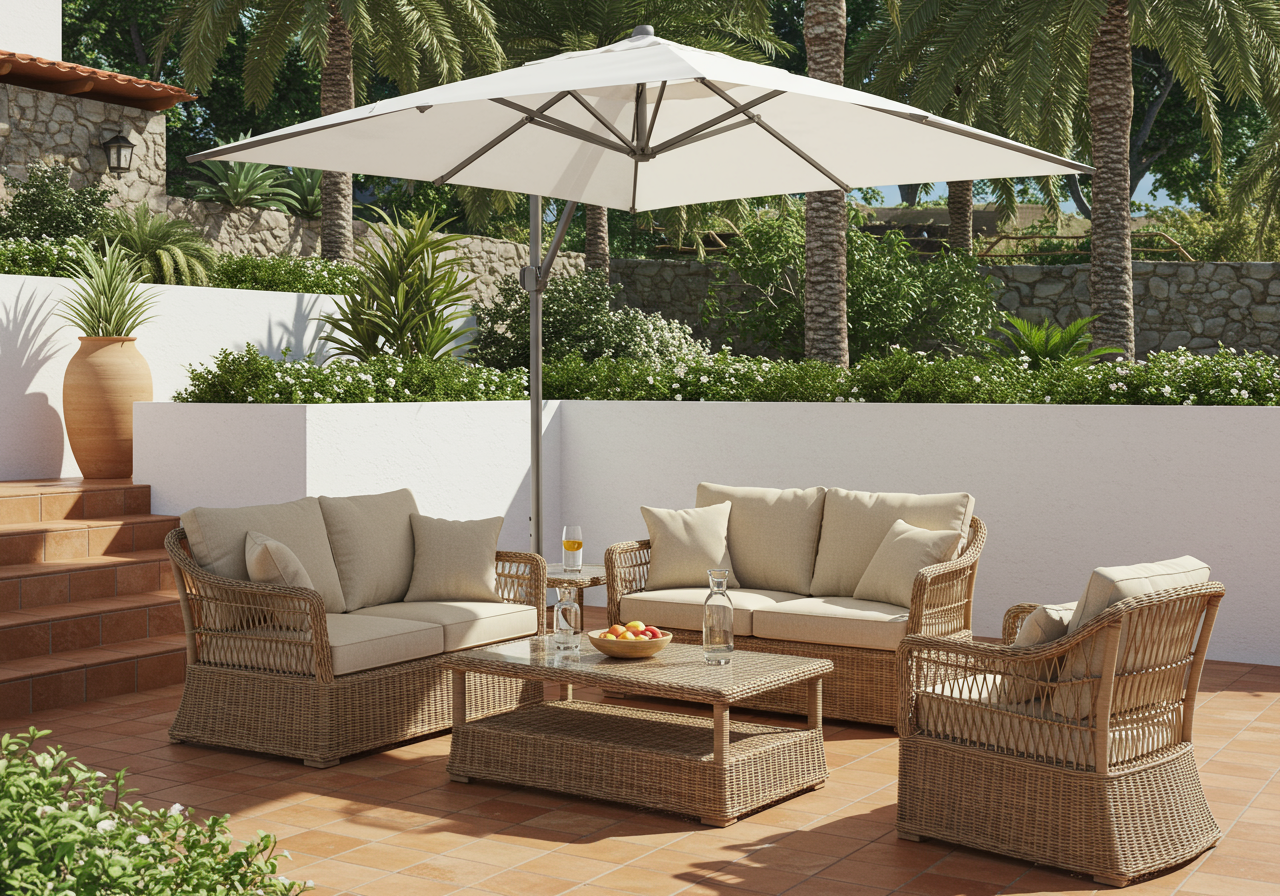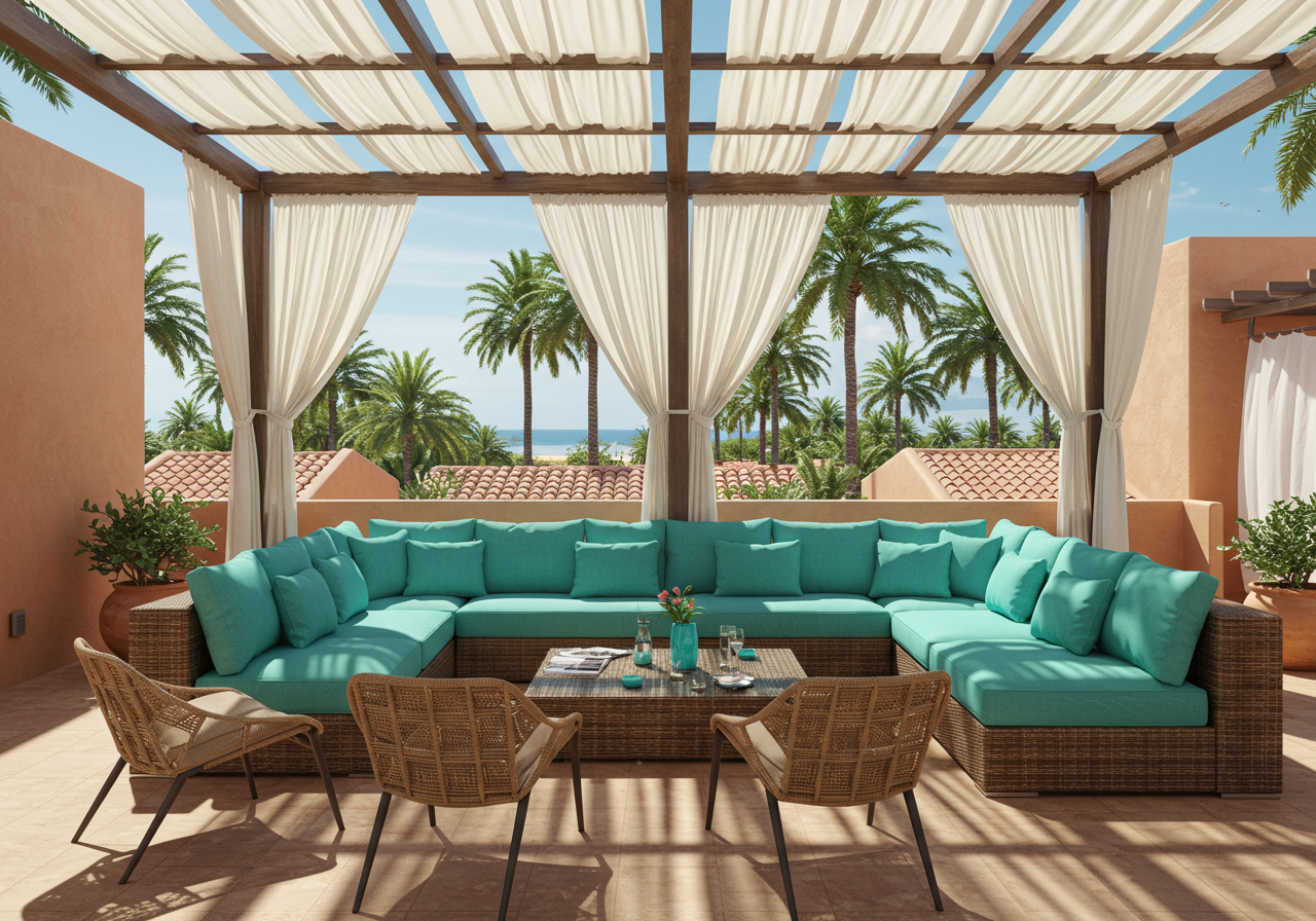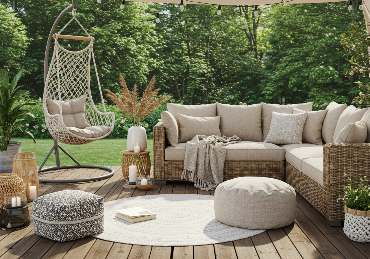 Make your patio have a natural transition between your home and backyard. Include furniture that is a mix of both indoors and outdoors, such as wicker chairs with decorative pillows.