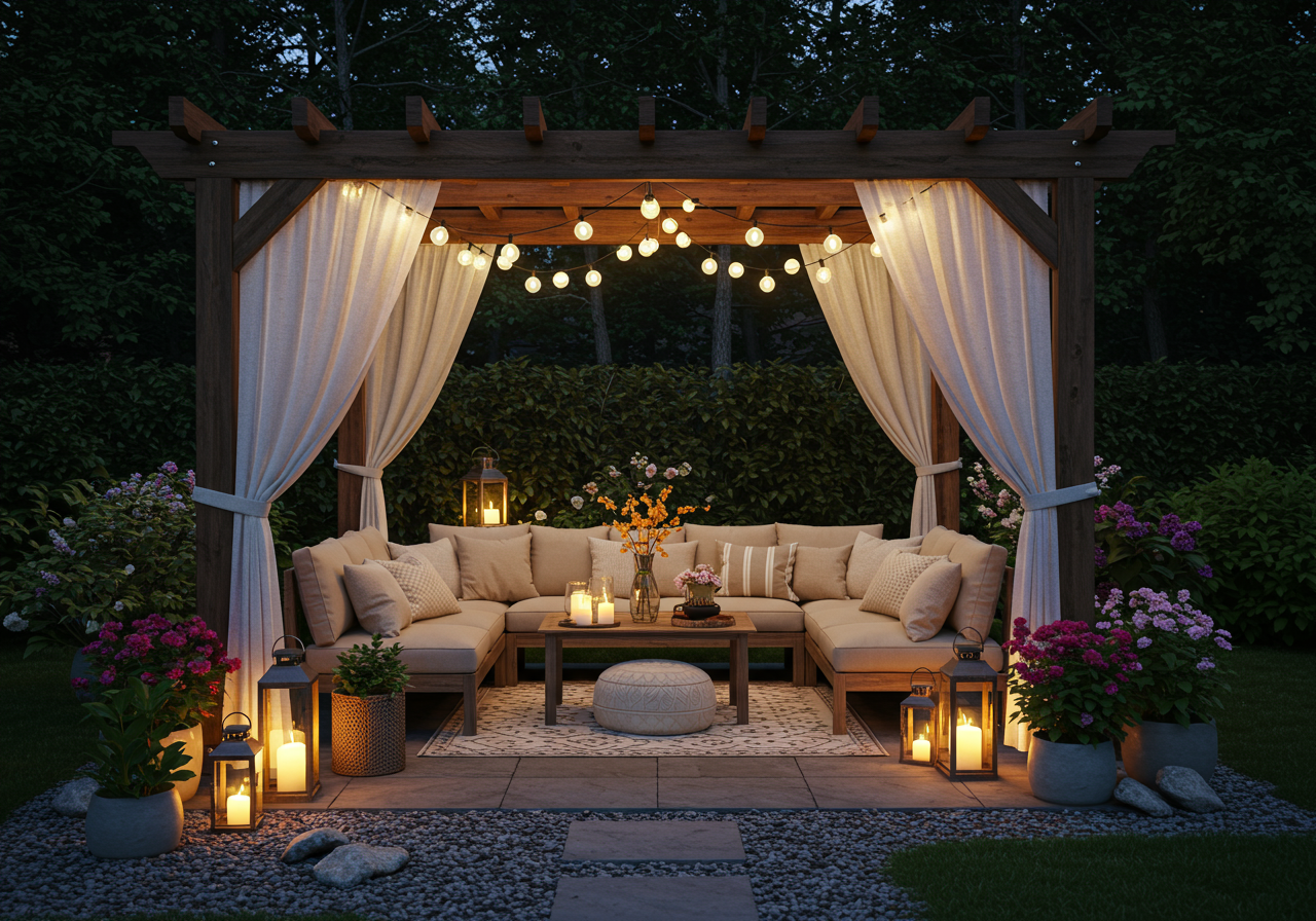 Get floor pillows that you and your guests can use to sit on the ground for more relaxed occasions. You can also cover the ground with an outdoor rug that will bring a little warmth into the space.